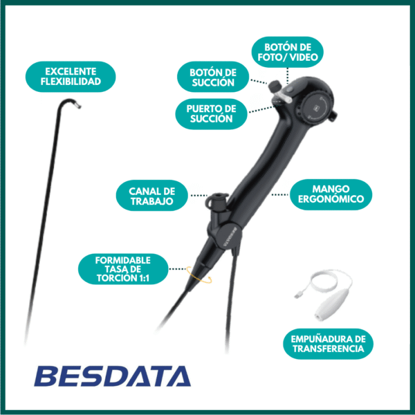 - Mango ergonómico: control preciso con respuesta 1:1 entre la mano y la punta del endoscopio.