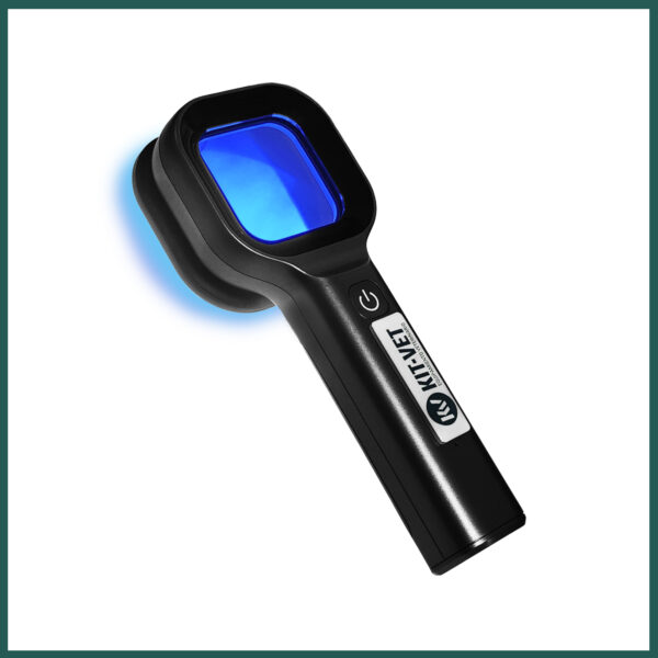 Es una lámpara de Wood portátil que utiliza luz negra (UV) para realizar exámenes por transiluminación.
